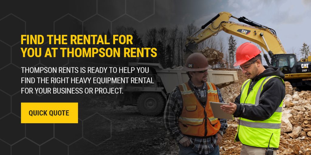 Thompson Rents is ready to help you find the right heavy equipment rental for your business or project. To choose the equipment that is right for you, you can come to one of our multiple locations in Alabama and northwest Florida, speak to a rental specialist at 800-547-0760 or get a quote online.